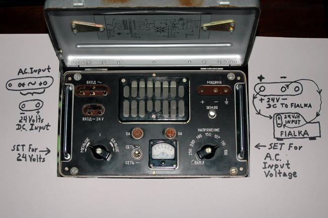 Note that the two pins on the Fialka's connector receive +24 volts on the top