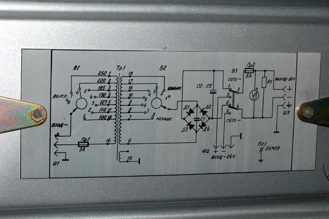 A close view of the back of the Fialka 24 volt DC power supply showing the