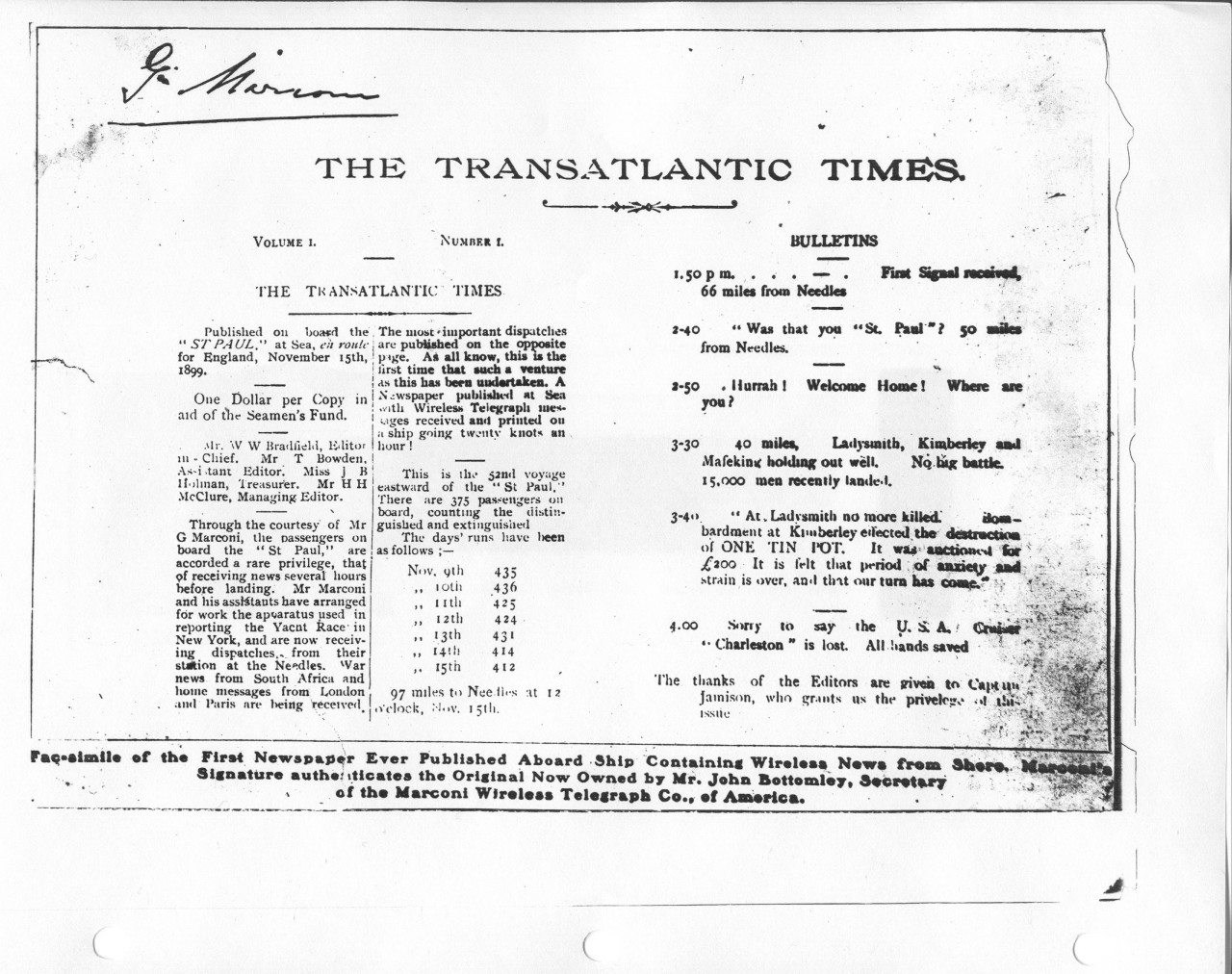 news from shore was published aboard the St. Paul en route for England on November 15th, 1899.