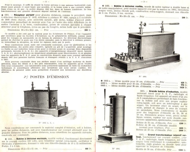 | Laboratoires Louis Ancel (ELLA- Anciens et Louis Ancel) | 1909 | Paris, France | No.4003 induction coil set capable of 10 cm spark. Louis ANCEL catalog dated January, 1914, shows similar equipment on pages 2 & 3. (" Télégraphie & téléphonie sans fil et Télemecanique sans fil" ) |