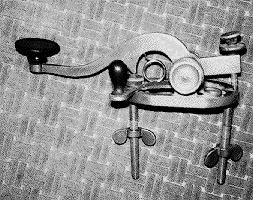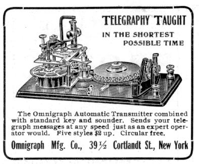 A number of ingenious devices have been invented to help people learn and practice copying the code. One of the first of these was the Omnigraph. It used one or more aluminum disks with the code characters cut as notches in their outer rim. As the disk(s) rotated, the notches opened and closed an electrical contact which could be used to operate a sounder or buzzer. Omnigraphs were available in several models from simple 1 disk hand-cranked versions to 10 and 15 disk spring-driven models which automatically switched between disks. [194] The Natrometer and Teleplex are very similar spring driven code wheel practice devices. [194a]