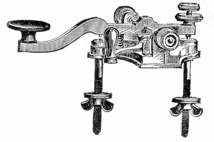 The "Leg" Triumph Style Key was designed to be screwed permanently through the operating table. The electrical connections were made under the table to the legs. These keys were made by the tens of thousands from 1881 through the 1950's. These "Leg" style keys are quite common. [102]
