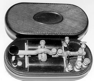 Tiny pocket-sized key-and-sounder combinations called "Pocket Sets" or "Pocket Relays" and used by linemen and Civil War spies are very rare and hard to find. They are often found in oval hard-rubber cases.(shown) [90]