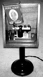 or an articulated swinging arm that could be brought near the operators ear. [142a] To allow a telegrapher to be able to distinguish his/her sounders clicks from other nearby sounders, a Prince Albert Tobacco can was tucked between the sounder and the wooden box. Opening or closing the lid of the tobacco can changed the tone of the sounder and made its sound distinct from the other nearby sounders.