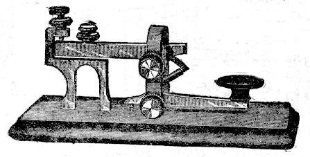 Several kinds of non-electric key-sounder combinations were made and used for teaching and learning the Morse Code. They produced clicking sounds when the key was pressed. This one uses a mechanical lever connection between the key and the sounder. [160]