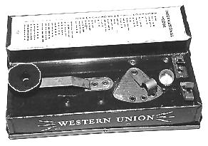 Key-and-sounder combination sets (KOB's) from this period are VERY COMMON. [150] Slightly higher prices are usually paid for sets with pretty oval BRASS-based keys and brass armature sounders. Slightly lower prices for sets with oval, black painted cast IRON or steel-based keys and/or sounders with the more recent aluminum armatures.