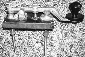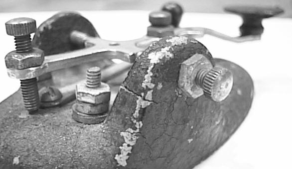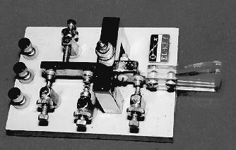Amateur radio operators are known for their ingenuity. If they couldnt afford a fancy spark key with large silver contacts, they made one out of what was at hand. The lever of this early Western Electric land-line key was extended out and away from the operator and a set of large contacts was arranged to carry the heavy current and dissipate the heat. [496] (Gerry Maira, KA2MGE collection)