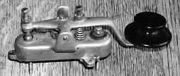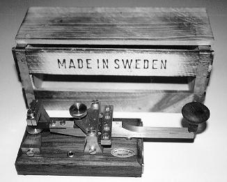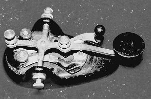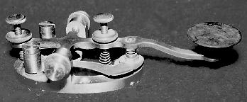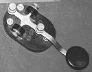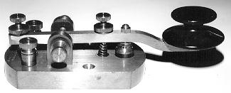 This key is being produced in limited quantities in Sweden. It is patterned after the very early Swedish land-line keys and has a wonderful "feel". [570] Unlike most other keys, it has no trunnion shaft at all. Instead, a thin piece of spring steel acts as the support for the lever and flexes as the key is pressed. This is similar to the Steiner Key design (See No 118)