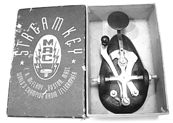 Ted McElroy manufactured a very popular line of radio keys which are thoroughly described in Tom Frenchs book "McElroy" (see bibliography). Starting with a rectangular-based model, [520] he quickly shifted to an oval-based "Triumph-key" look-alike [522] and then introduced the first model of his VERY popular teardrop-shaped "Stream Key" in 1938.