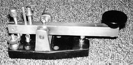 This s a very unusual key. The contacts and adjusting screws have rubber bumpers which reduce the clicking sounds as the key is operated. It was probably used as a practice key and the clicks were eliminated to avoid bothering nearby students in a large classroom. It has the classic European style straight lever and pull-down spring. [624] (W2PM collection)