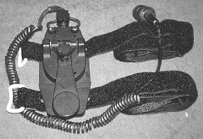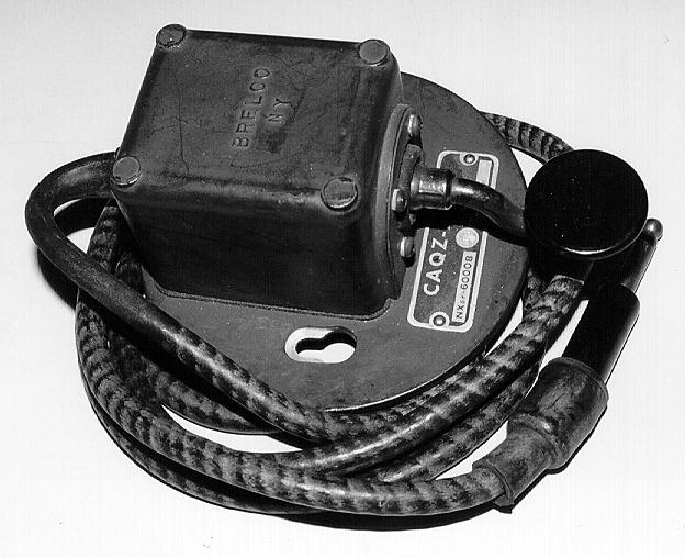 This flameproof key is mounted on a circular metal base which clips to the panel of several radio sets and to a thigh-mounted leg clip. The model number starts with CAQZ which shows that it was made by Brelco. [694]