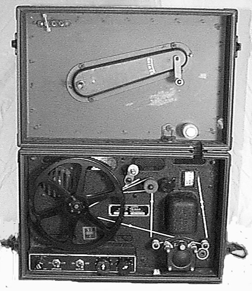This set was designed to automatically send audio tone dot and dash signals at varying speeds for students to practice copying by hand or on a typewriter. A variable speed electric motor pulled a paper tape past a photoelectric tube. A light shined through to the photoelectric tube unless it was blocked by black ink marks on the tape. This determined when the oscillator would be keyed to make the tones. (From the Derek Cohn WB0TUA collection.)