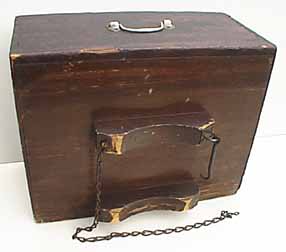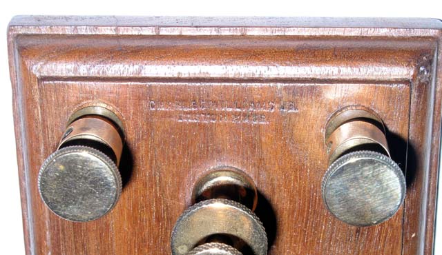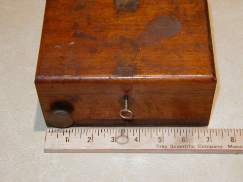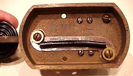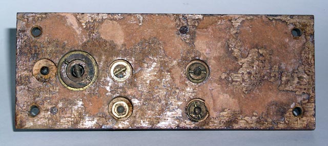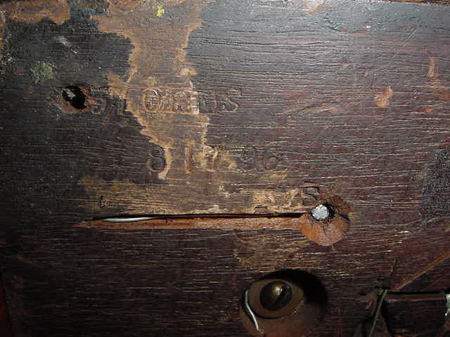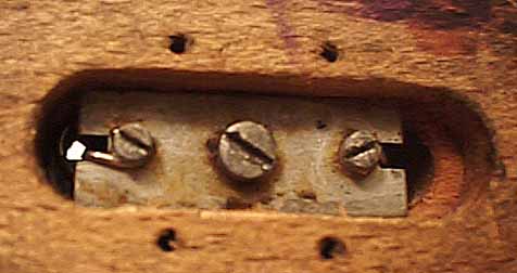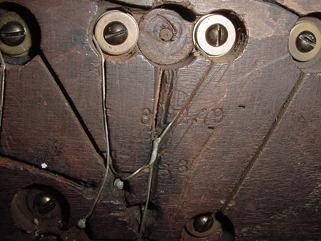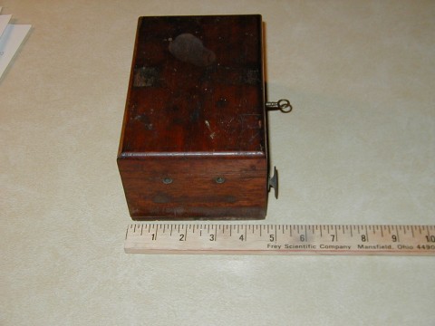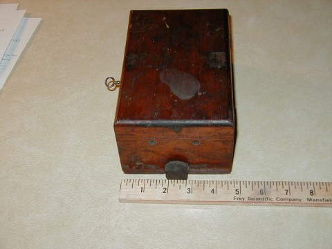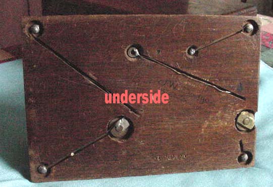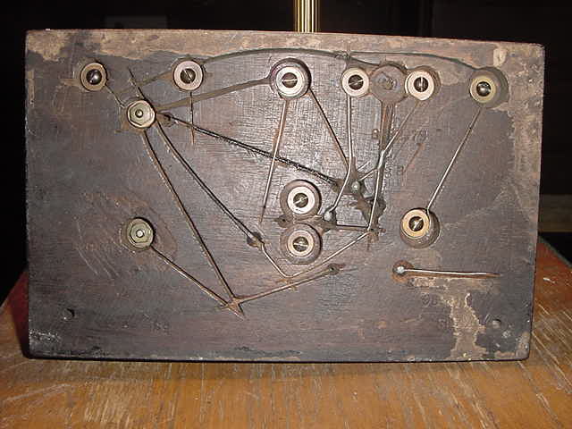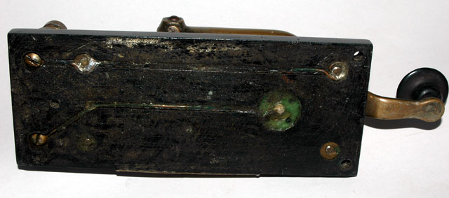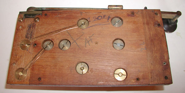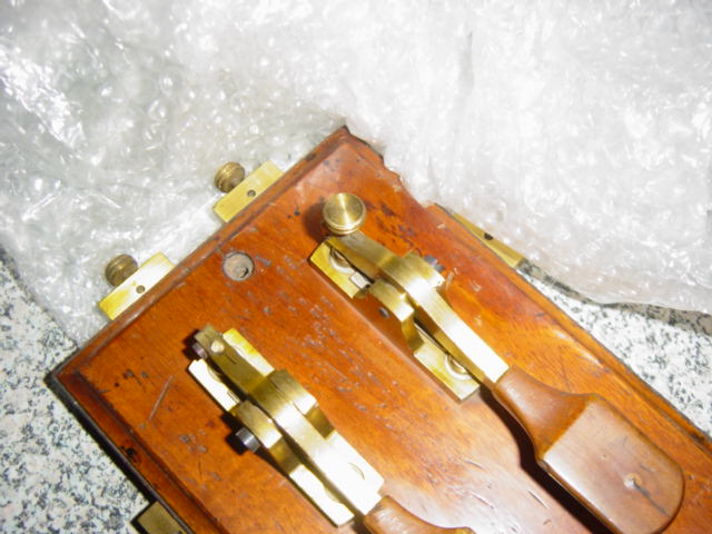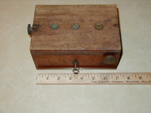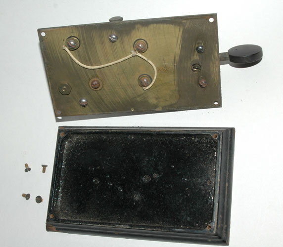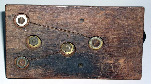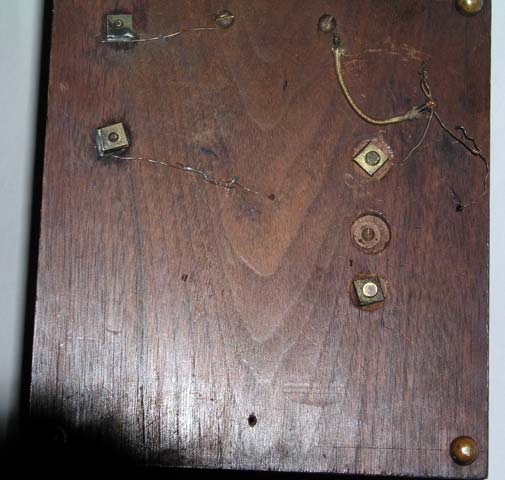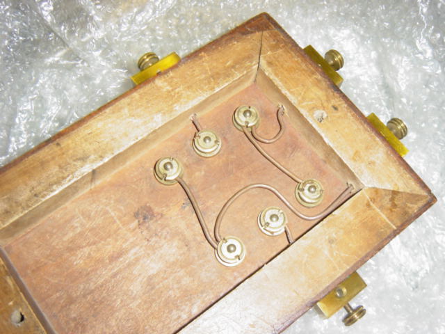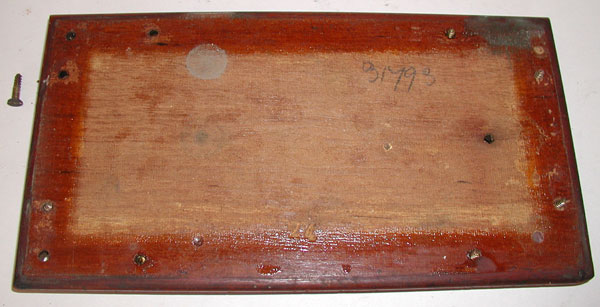 old wooden case. Beveled glass. Large brass contact screws. Bottom of