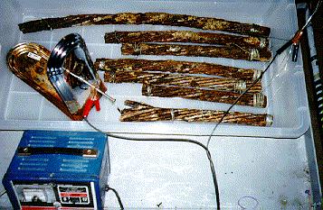 I cut the cable into shorter pieces and stored it wet as I prepared to do the electrolysis that I understood was necessary to stabilize and conserve the steel. Apparently the salt from the ocean gradually finds its way into the metal over a period of many years and when the metal dries out, I am told that the embedded salt crystals expand and gradually cause the metal to disintegrate. I had this happen to a lovely cannon ball that I found. One year it was a great cannon ball and the next year it was a pile of rust powder. I hoped to avoid having this happen to the telegraph cable!